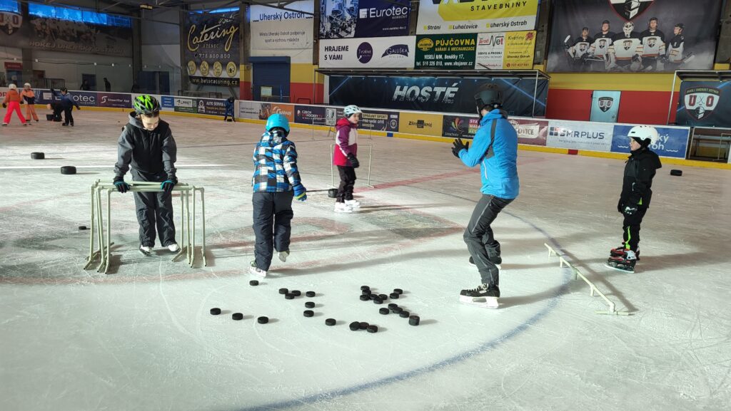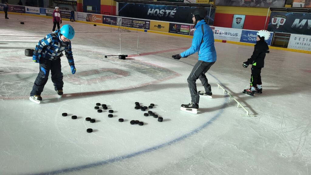 Každou lekci jsme začínali rozbruslením, při kterém se děti protáhly, procvičily rovnováhu a připravily se na další část hodiny. Po krátkém zahřátí následoval nácvik bruslařské dovednosti – pracovali jsme na základním skluzu, jízdě vpřed i vzad, zastavování, slalomu či jednoduchých obratech. Každý si tak zkoušel něco, co ho posunulo zase o kousek dál.