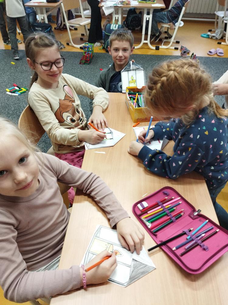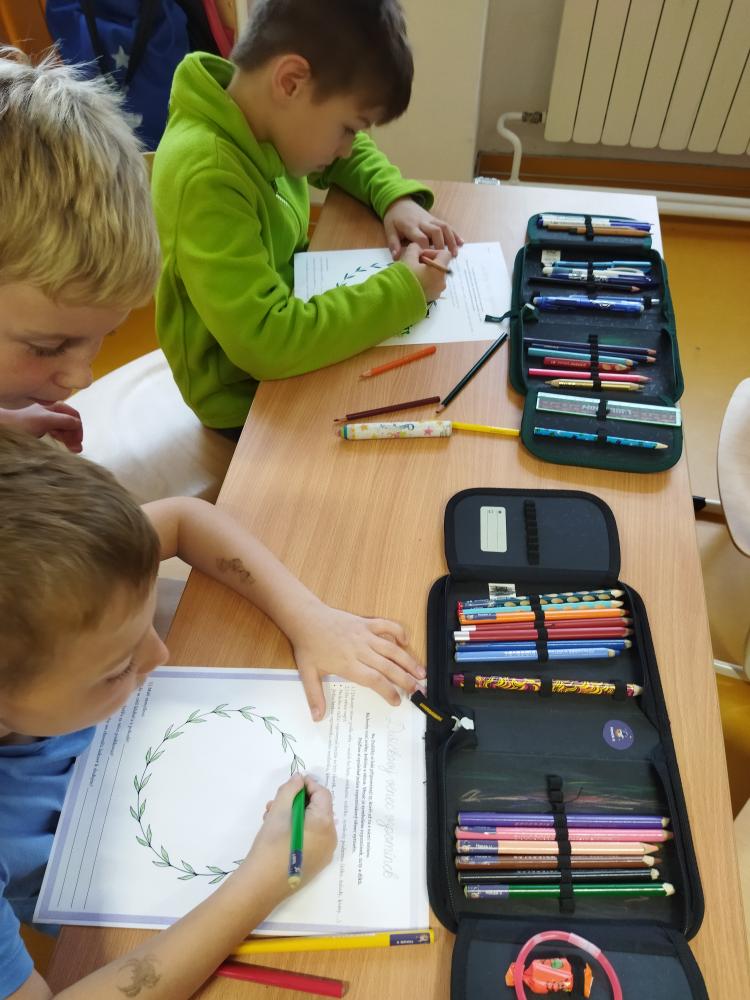 V prvních listopadových dnech jsme si ve školní družině povídali o významném svátku – Památce zesnulých, lidově zvané Dušičky. Seznámili jsme se s podstatou tohoto svátku, který není smutný, ale spíše vzpomínkový a plný světla, lásky a úcty k těm, kteří už nejsou mezi námi. Naše povídání jsme zahájili čtením citlivého a krásného příběhu „Světýlko pro babičku“. Děti se tak dozvěděly, proč lidé zapalují svíčky na hřbitovech, co znamená vzpomínat a jak lze i malým gestem vyjádřit lásku a vděčnost. Příběh nám pomohl pochopit, že Dušičky nejsou jen o smutku, ale hlavně o vzpomínkách, které hřejí u srdce. V tvořivé části jsme se pustili do kreslení dušičkového věnce a výroby papírové lucerničky. Každý věneček byl jiný – plný barevných listů, svíček a květin. Děti se zamýšlely nad tím, komu by věneček věnovaly, a vznikla tak krásná galerie plná emocí. Na závěr jsme si pustili pohádku „Chaloupka na vršku – Jak to bylo na Dušičky“, která nám krásně doplnila naše povídání a tvoření.