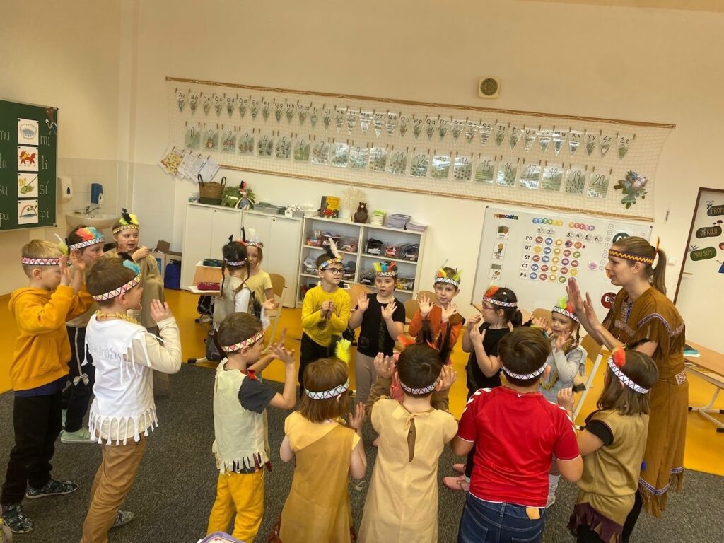 Prvňáčci dočetli poslední stránky Živé abecedy a pomalu se z nich stávají čtenáři. Aby se naučili spojovat slabiky do slov a slova do vět, k tomu budou potřebovat další učebnici, a tou bude právě Slabikář. Posledním písmenkem, které se děti naučily v Živé abecedě, bylo písmenko I, a tak jsme tento den prožili jako indiáni. Školáci plnili indiánské úkoly a za každý dostali pírko na čelenku, kterou si v první hodině vyrobili. A to nejlepší přišlo nakonec. Indiáni se museli plížit po stezce vyznačené pírky až k pokladu, kterým byla truhla plná Slabikářů a dobrot. Tak ať nám to čtení jde s takovým nadšením, jako byl tento den.