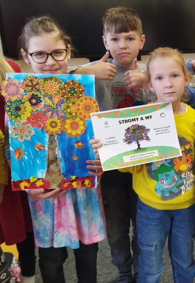 V letošním ročníku výtvarné soutěže Stromy a my 2025, kterou pořádal dům dětí a mládeže Pastelka v Uherském Ostrohu, se naší školní družině podařilo získat krásné 3. místo v kategorii skupinová práce. Nejlepší práce ze soutěže budou vystaveny v Domě přírody Bílých Karpat ve Veselí nad Moravou. Přijměte tedy pozvání na výstavu, která potrvá od 17. ledna do 15. března 2026 a nabídne návštěvníkům možnost nahlédnout do světa dětské fantazie i citlivého vnímání přírody.